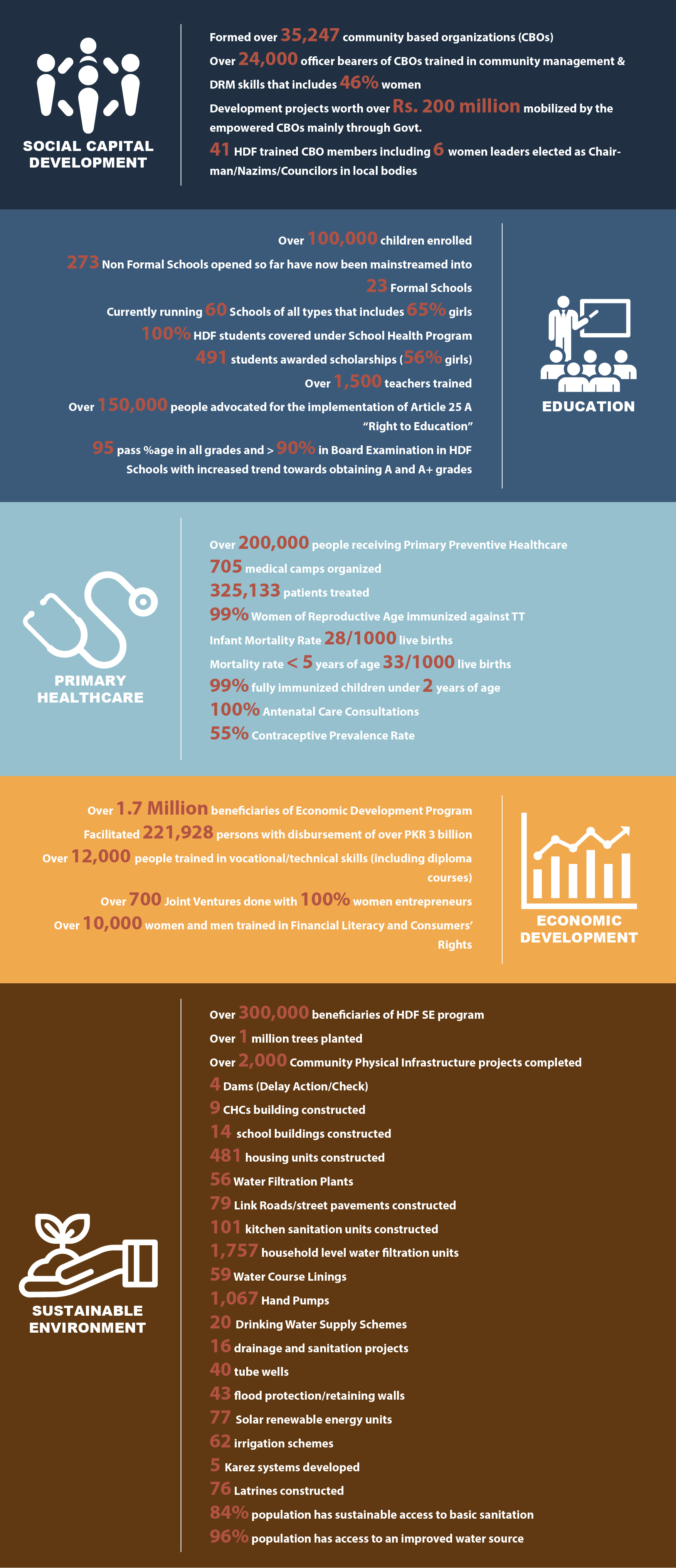 The goal was to give people in rural Pakistan the tools to move out of poverty and to lead a life of dignity. HDF envisioned a Pakistan where every child attends school; health care is for all; clean drinking water is not a luxury; and communities are vibrant and self-sustaining.